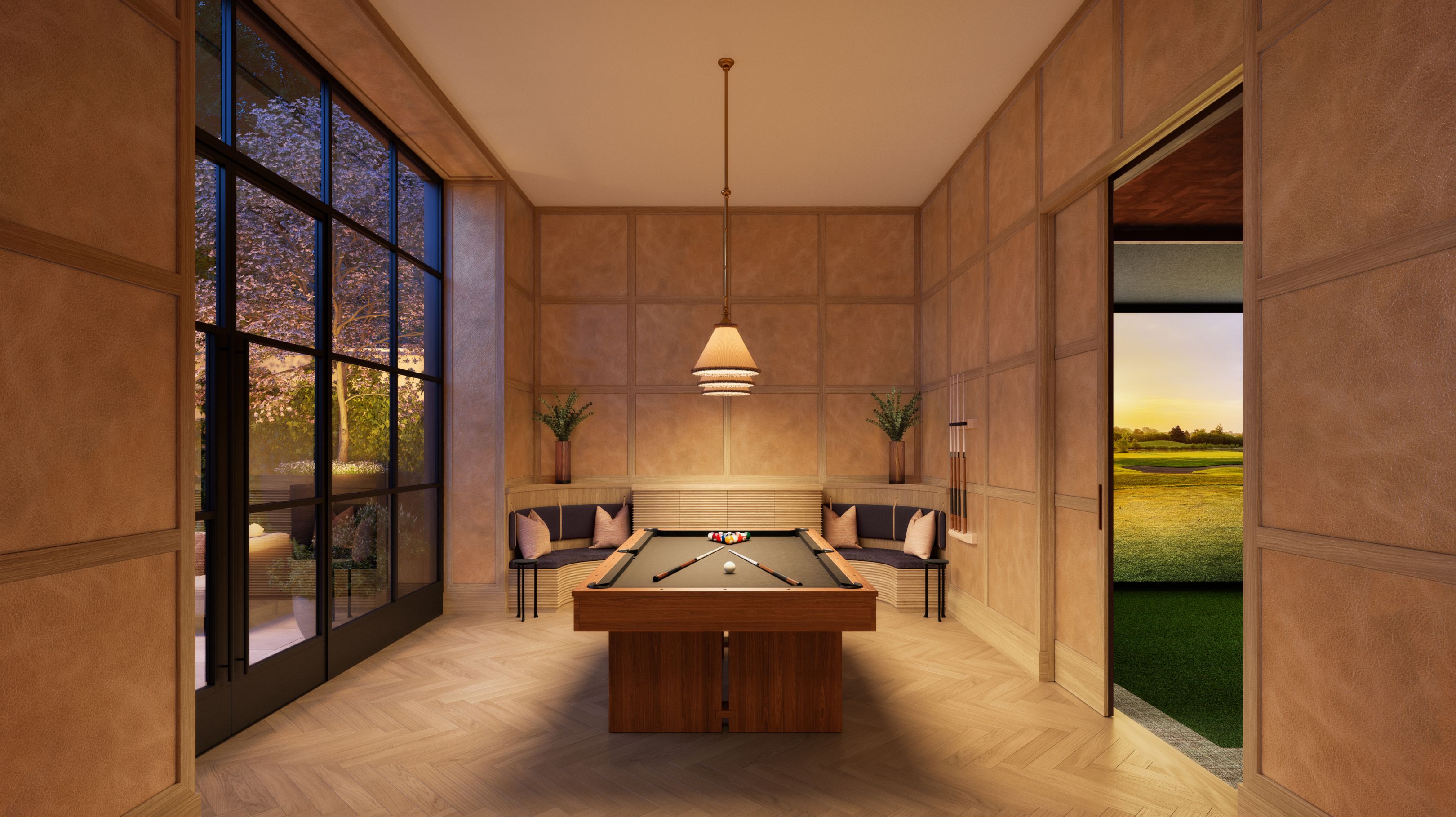 A visit to Musée de la Chasse in Paris inspired the leather-accented walls and warm ambient lighting in the billiards room.