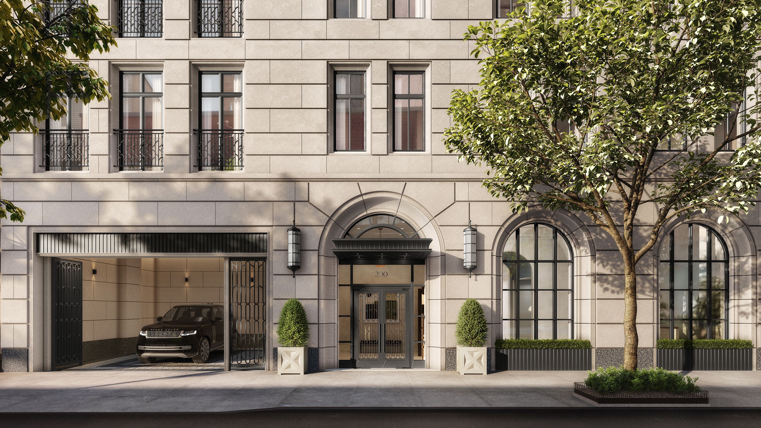 The residential entrance along East 75th Street will sit beneath a dark canopy flanked by two large light fixtures and a pair of planters. An adjacent garage door leads to the building’s on-site parking facility.